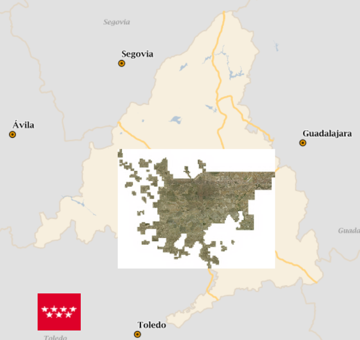 Vuelo fotogramétrico parcial de la Comunidad de Madrid, términos municipales de Alcobendas, Alcorcón, Casarrubuelos, Valdemoro, Ajalvir, Alcalá de Henares, Arganda del Rey, Arroyomolinos, Batres, Boadilla del Monte, Cubas de la Sagra, Brunete, Daganzo de Arriba, Fuenlabrada, Campo Real, Ciempozuelos, Paracuellos de Jarama, Parla, Coslada, Galapagar, Getafe, Griñón, Humanes de Madrid, Leganés, Loeches, Madrid, Majadahonda, Mejorada del Campo, Moraleja de Enmedio, Móstoles, Pozuelo de Alarcón, Navalcarnero, Pinto, Rivas-Vaciamadrid, Las Rozas de Madrid, San Fernando de Henares, San Martín de la Vega, Los Santos de la Humosa, Serranillos del Valle, Torrejón de Ardoz, Torrejón de la Calzada, Torrejón de Velasco, Torrelodones, Torres de la Alameda, Velilla de San Antonio, Villalbilla, Villanueva del Pardillo, Villaviciosa de Odón, Valdemorillo, El Escorial, Villanueva de la Cañada, Colmenarejo, El Álamo, San Lorenzo de El Escorial, Navalagamella, Quijorna, Sevilla la Nueva. Año:2007. Resolución: 0,1m. Productos disponibles: mosaico en formato ecw.